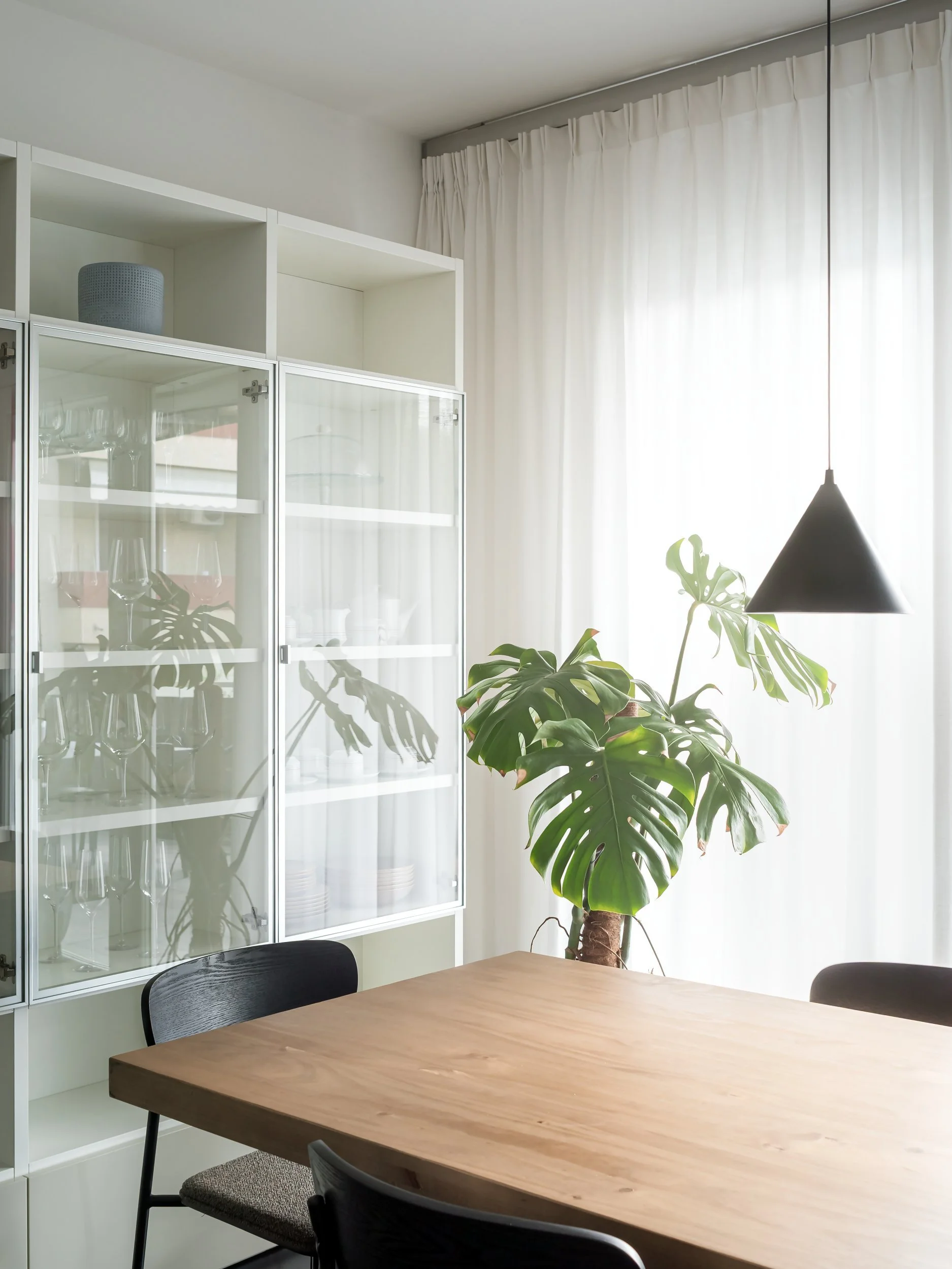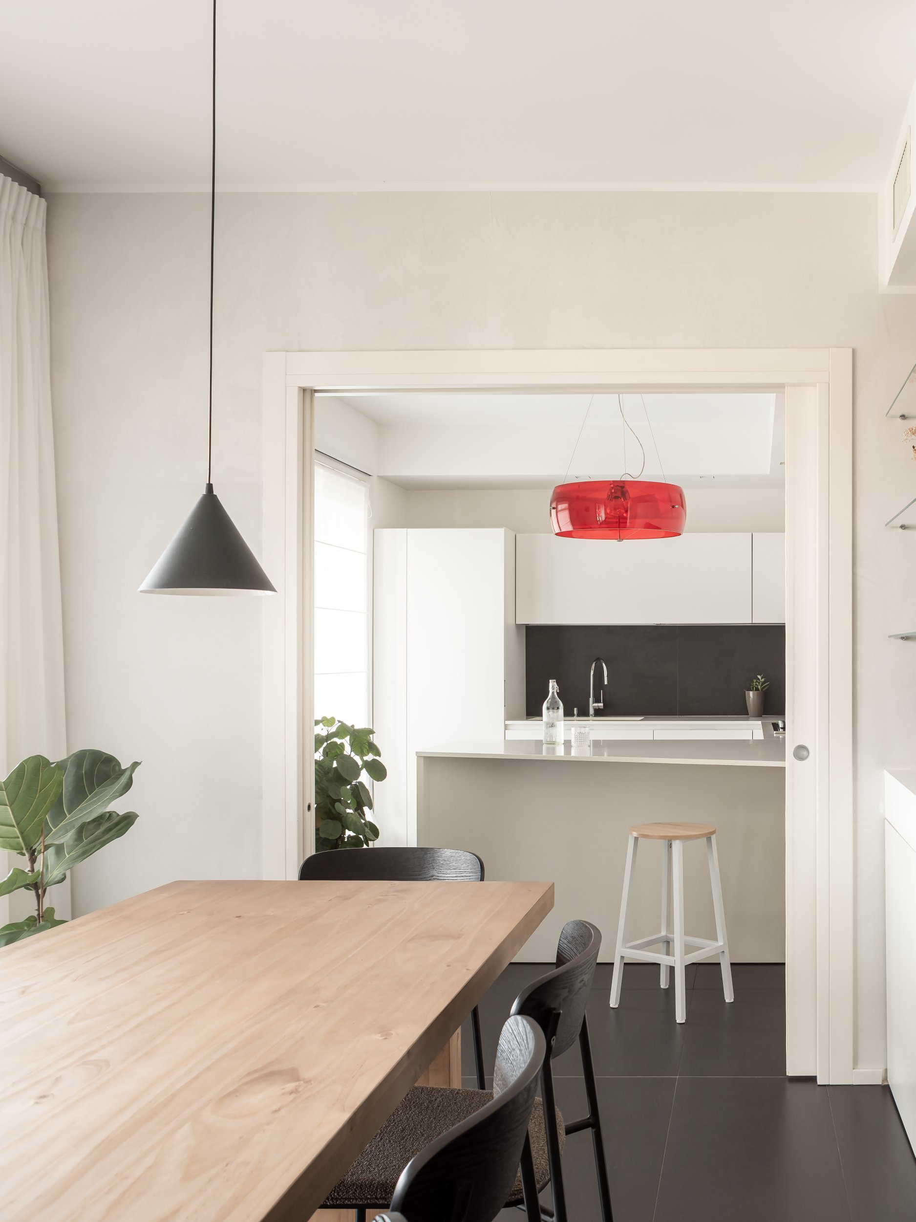 L’intervento coinvolge un appartamento di 100 mq, definito da una luminosità uniforme e da una distribuzione ripensata all’insegna della funzionalità. La zona giorno si sviluppa come una sequenza continua di spazi – soggiorno, pranzo e cucina – resi flessibili da una grande porta scorrevole che consente, quando necessario, di isolare l’area operativa evitando la diffusione degli odori nella parte living.