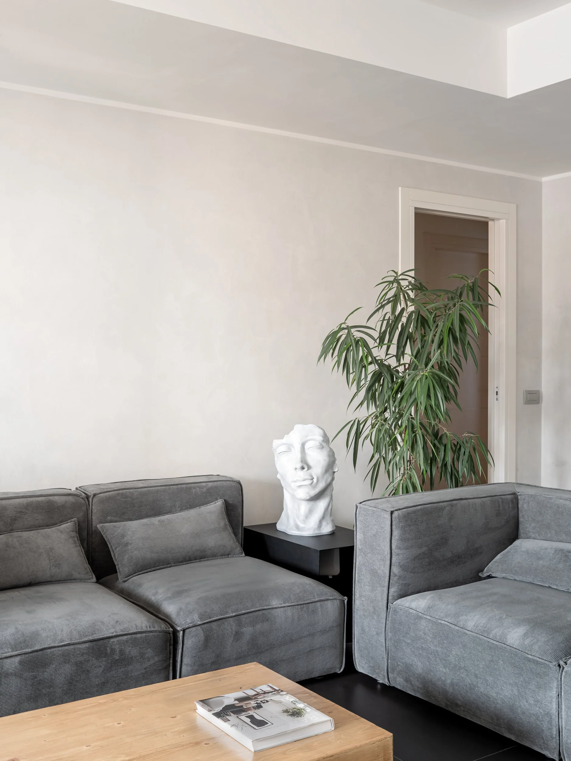 L'ampia terrazza a sud si configura come estensione naturale della zona giorno, garantendo continuità visiva e una relazione diretta con l’esterno. La zona notte adotta un linguaggio più raccolto, caratterizzato da toni neutri e arredi essenziali. Completano l’intervento il bagno rivestito interamente in mosaico verde, un’eccezione di colore all’interno di un progetto improntato a equilibrio, chiarezza distributiva e qualità del vivere quotidiano.